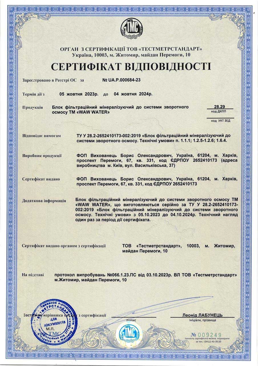 Гарантія розповсюджується на всю систему та комплектуючі, окрім картриджів, мембрани та інших компонентів, які необхідно замінювати згідно з рекомендованим регламентом (див. паспорт товару).