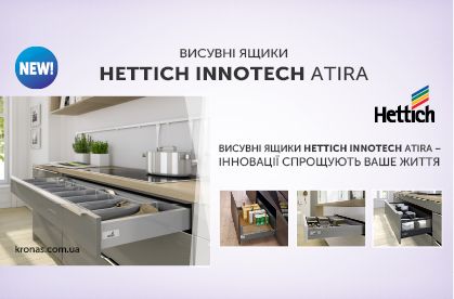 Висувні ящики InnoTech Atira від відомого німецького бренду -- нове покоління зручних рішень для приміщень будь-якого призначення. Компанія Hettich удосконалила концепт на основі попереднього досвіду і зробила систему зберігання і організації простору ще краще.